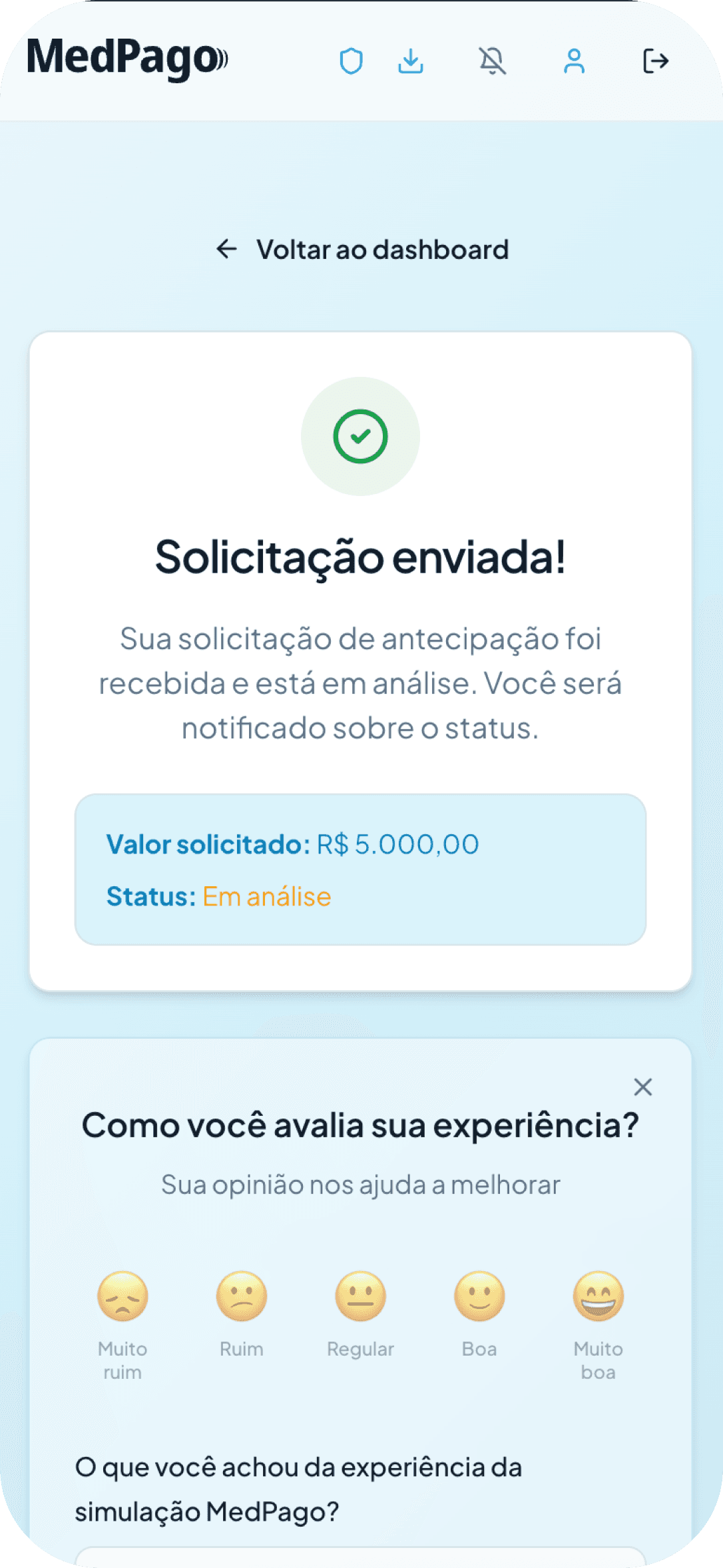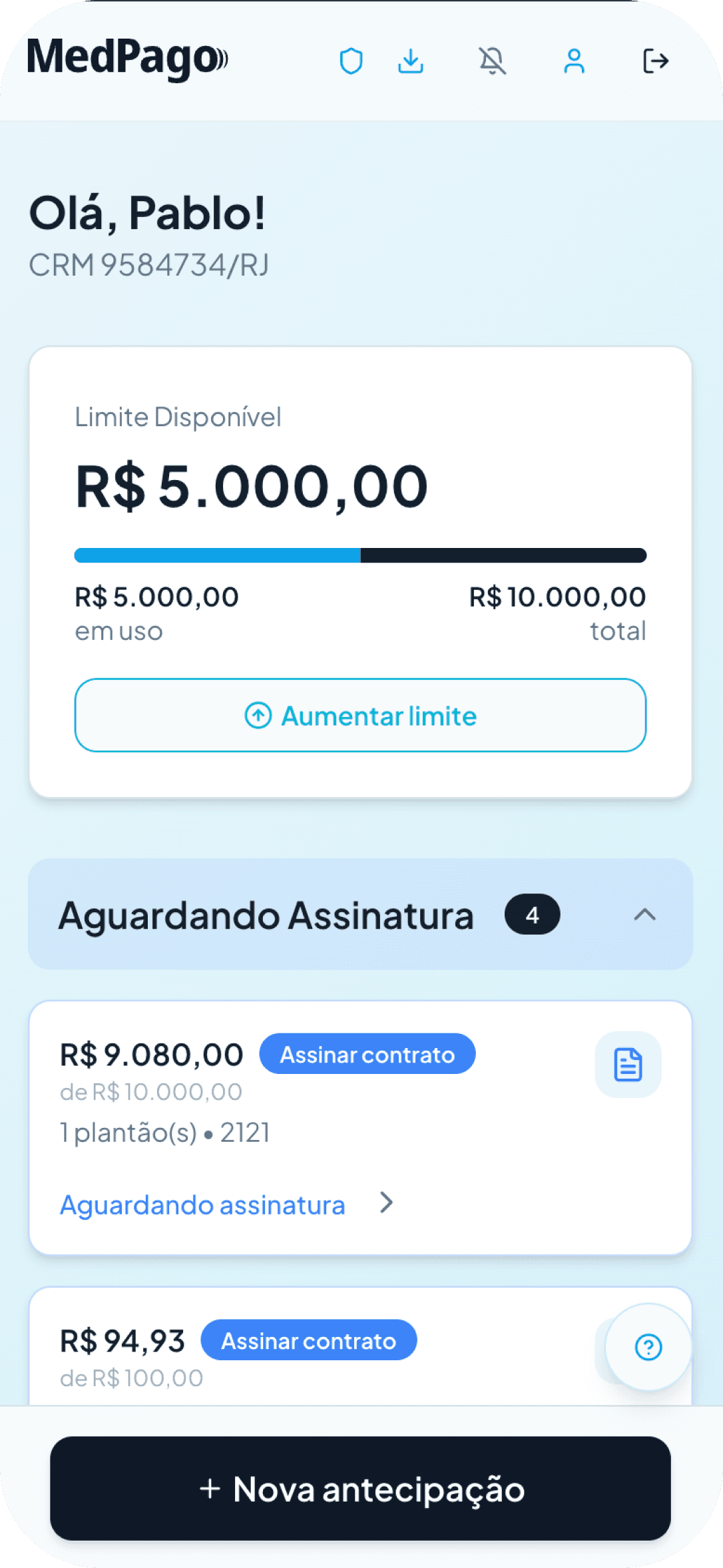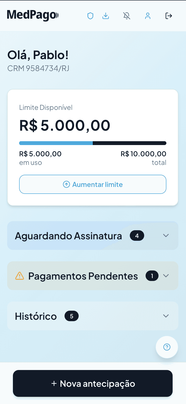 Na primeira antecipação conosco, fazemos uma análise do seu perfil para definir o melhor limite para você. Esse valor aumenta conforme você usa a MedPago e mantém seu histórico de pagamentos em dia.