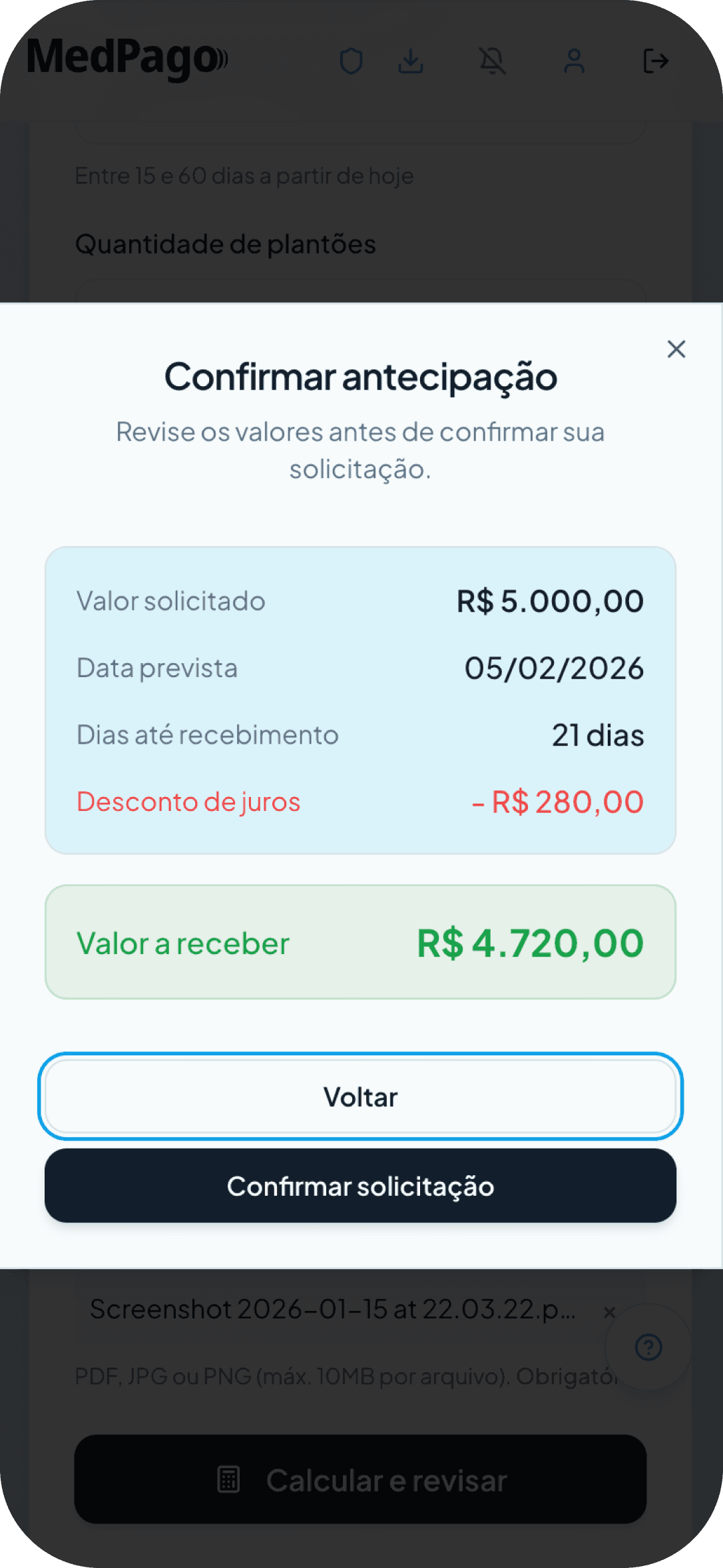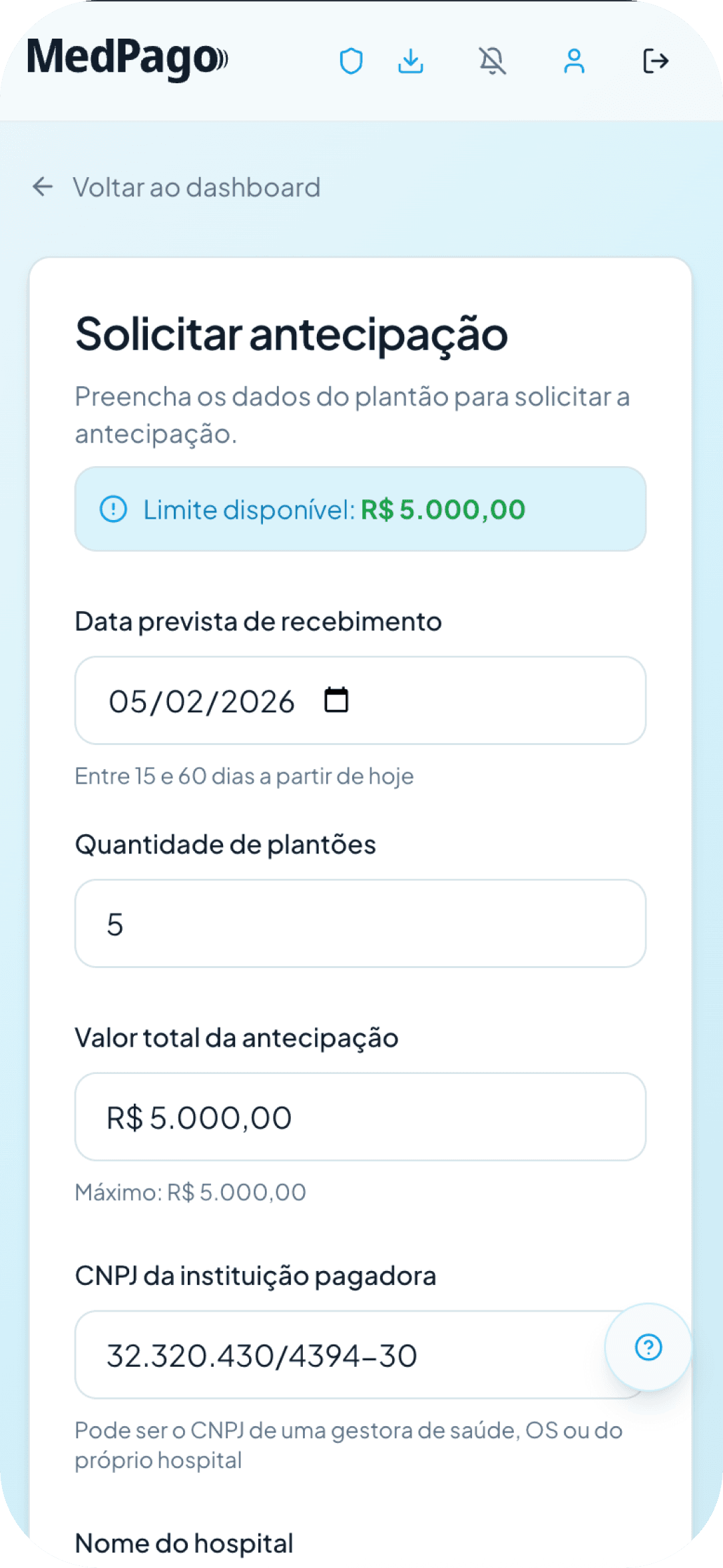 Você informa o valor e a data do plantão. O dinheiro cai na sua conta em até 24h, já com a taxa descontada. 💡 Exemplo: se o plantão é de R$ 5.000 para receber em 40 dias, você antecipa hoje e recebe R$ 4.800. No dia acordado com você, faz o pagamento dos R$ 5.000 para a MedPago.