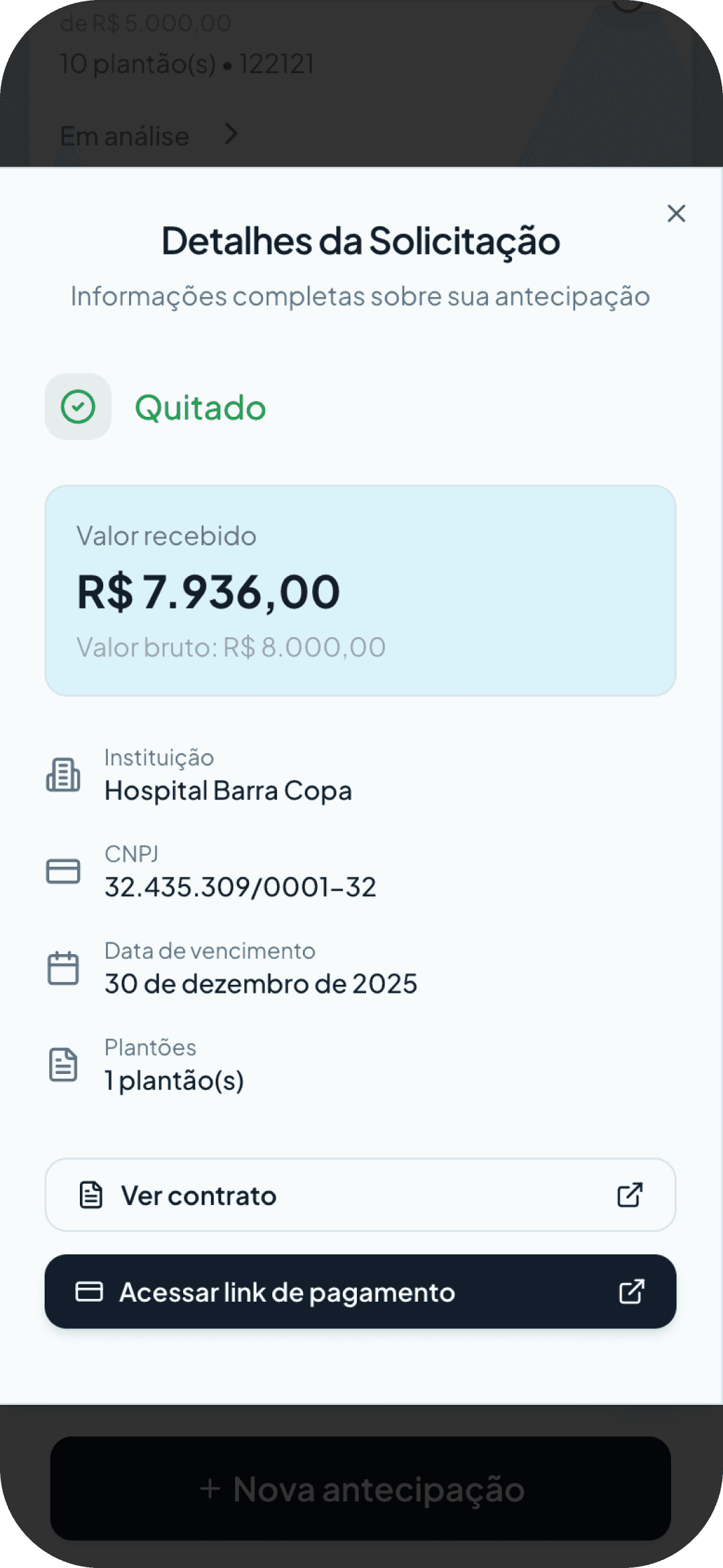 Depois da assinatura do contrato, o valor do plantão antecipado cai na sua conta em até 24 horas.